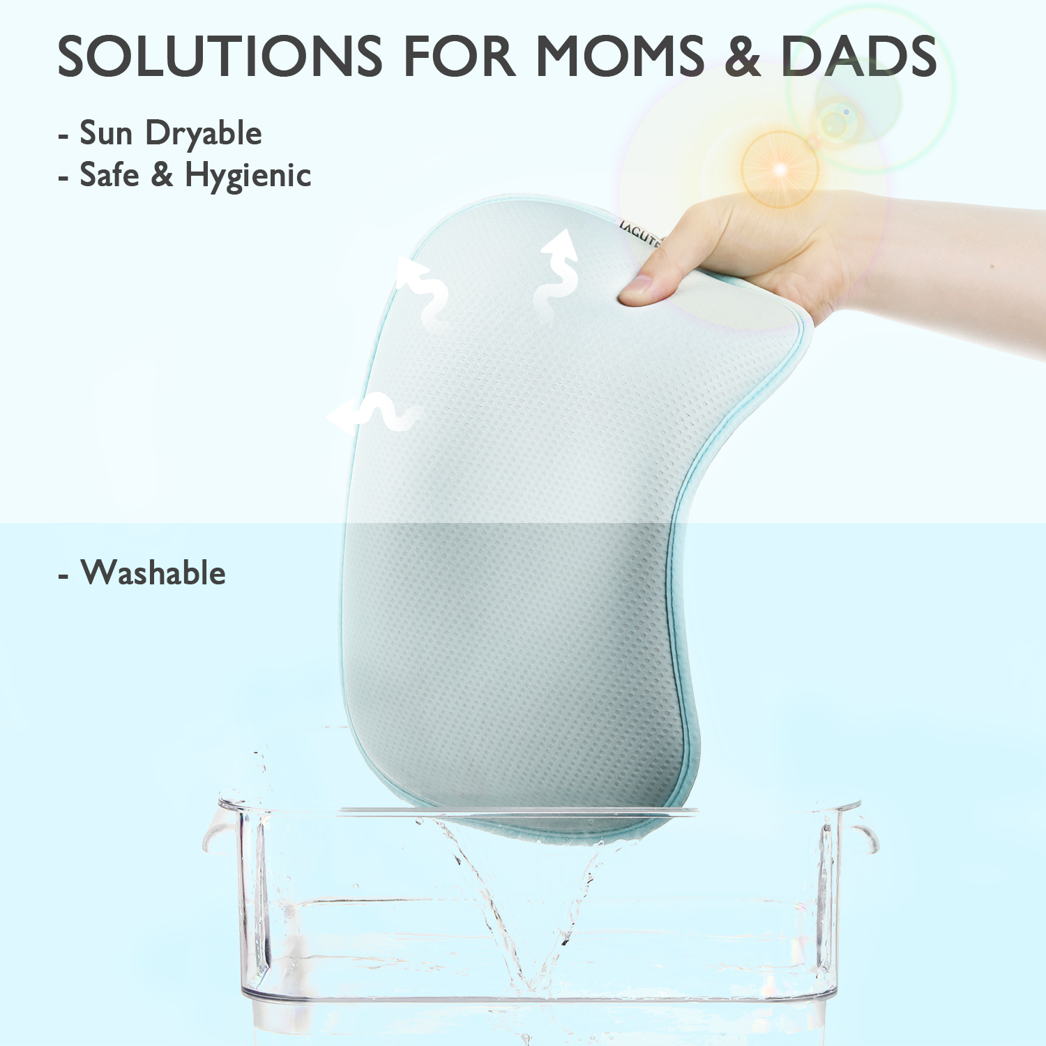 Gối cho bé Lagute Lunaby được thiết kế để hỗ trợ cổ và đầu của trẻ sơ sinh một cách thích hợp, ngăn ngừa và điều chỉnh bệnh Plagiocephaly, Brachycephaly và Scaphocephaly (Hội chứng đầu phẳng). Nó sử dụng sợi DuPont Sorona được USDA chứng nhận là sản phẩm sinh học. Gối có thể giặt bằng máy và giặt ở chế độ chu kỳ thấp và nhiệt độ thấp.